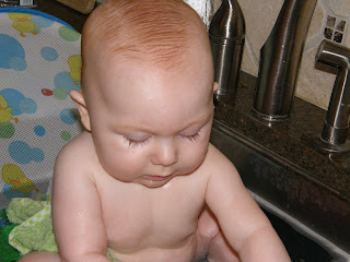 Luke is really starting to eat "solid" food now, if you call pureed strained foods solids, and his personality is really shinning through. He loves to smile and laugh, and is so happy! He is getting really good at sitting up, and I think by the end of the month might start crawling! Still no teeth, but lots of drool.